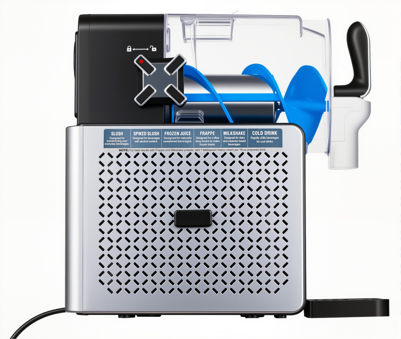 Det kompakte, stilrene designet passer inn på enhver benkeplate, mens den gjennomsiktige blandebeholderen gir deg full oversikt over prosessen. Du kan følge med mens drikken gradvis forvandles til en forfriskende, iskald konsistens.